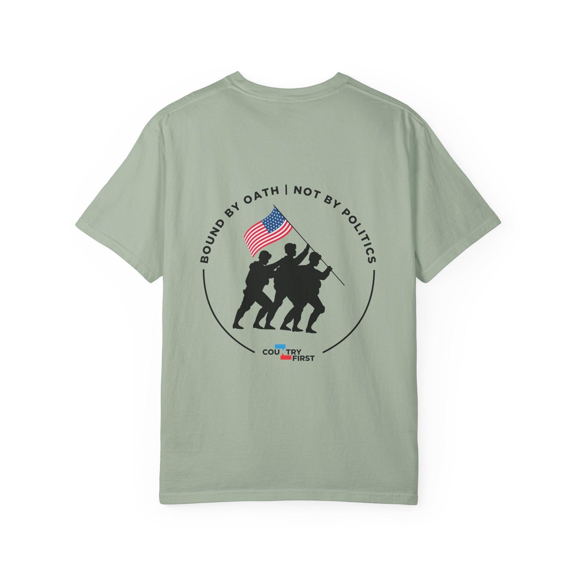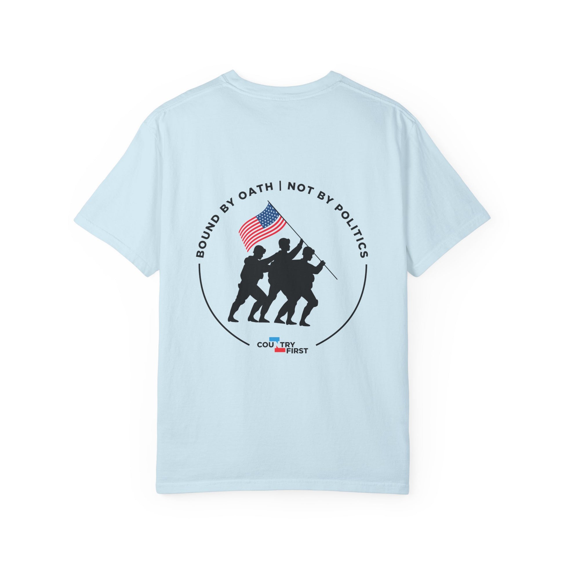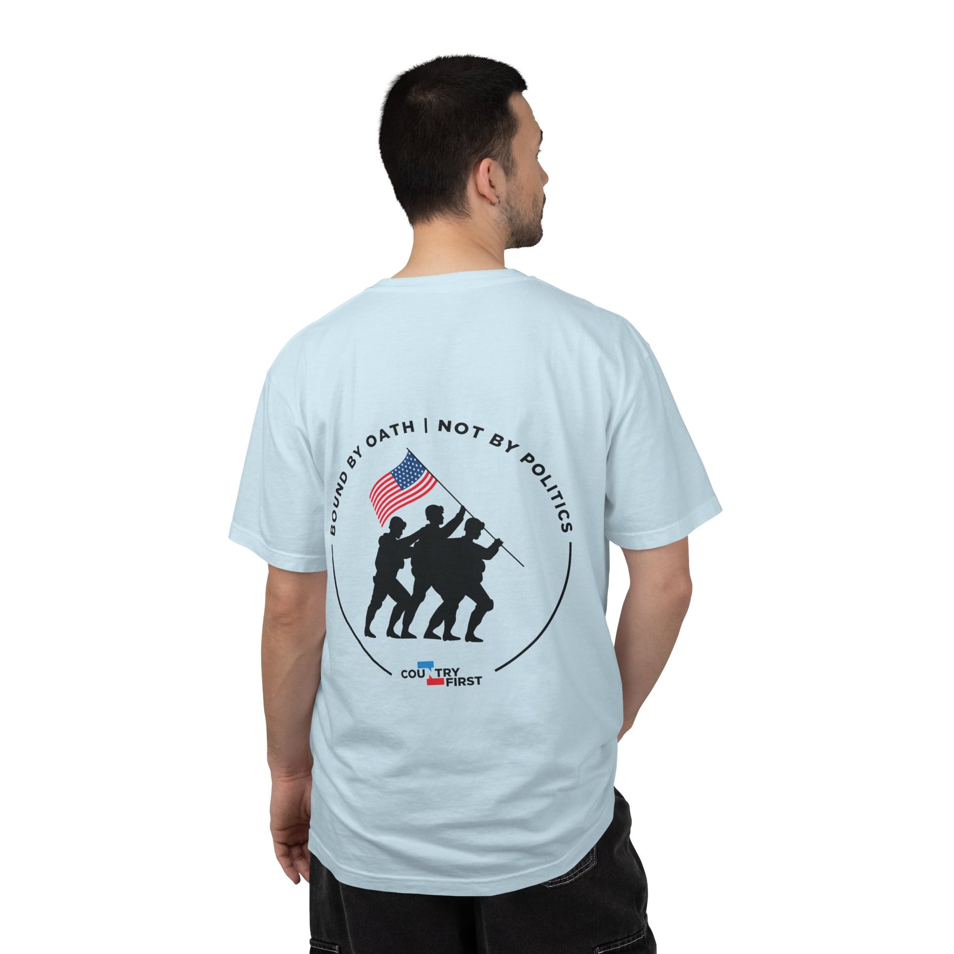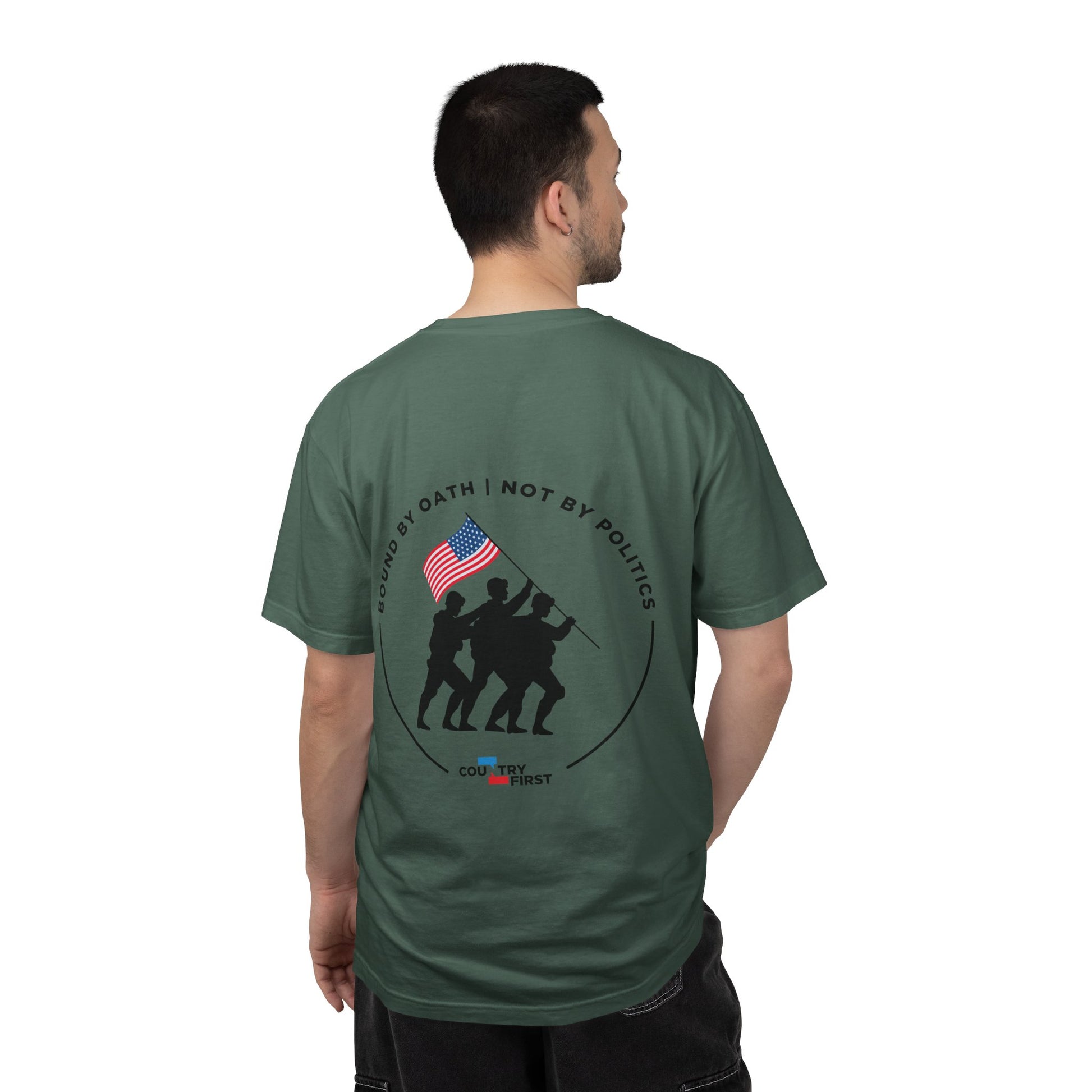 This heavyweight garment-dyed tee feels like a quiet pledge you can wear. The relaxed, slightly lived-in fabric settles in around your shoulders, softening with every wash. On the back, a bold silhouette of service members raising a flag sits inside a subtle circle, below the words “BOUND BY OATH | NOT BY POLITICS.” It reads like a personal statement—steadfast, uncomplicated, respectful. Small, minimal color blocks on the chest keep the front clean while nodding to the design on the back.