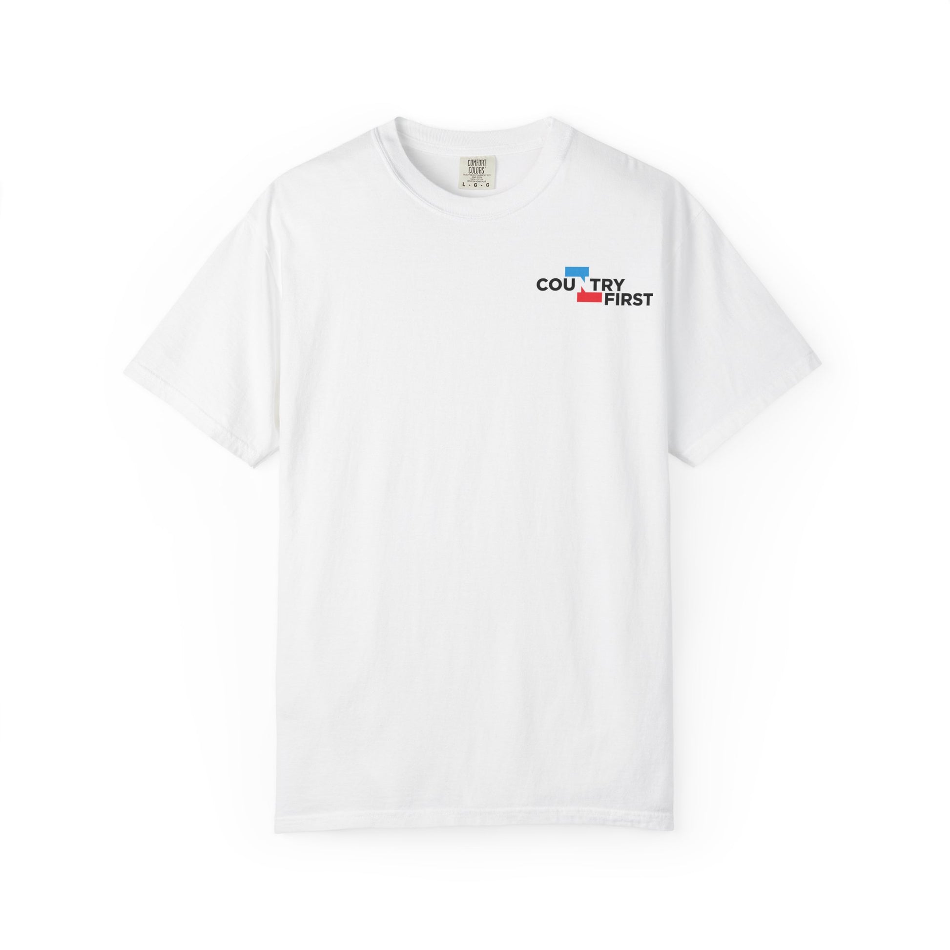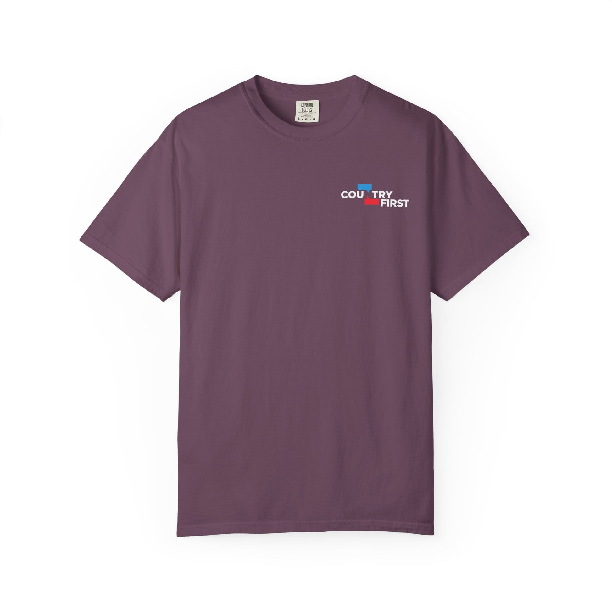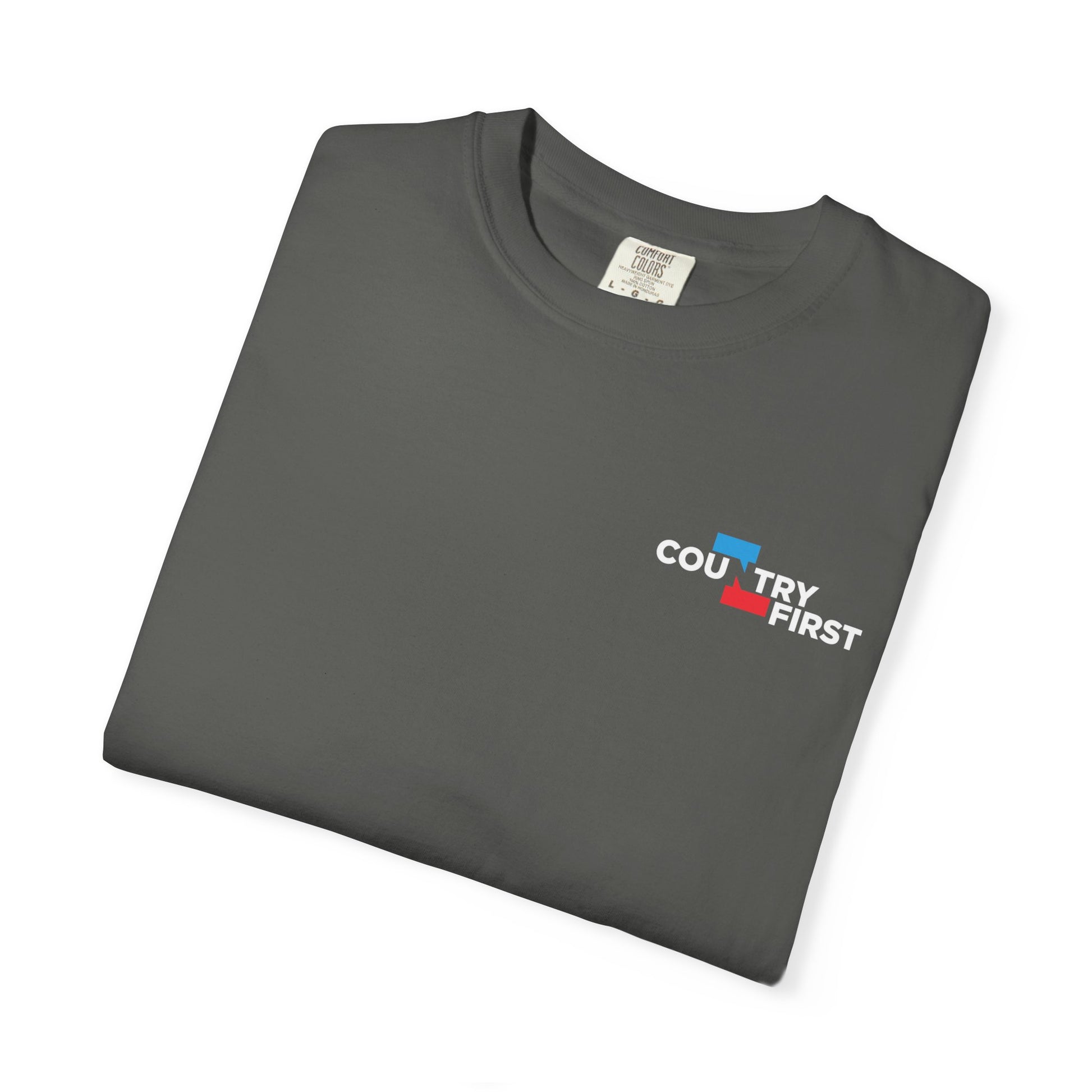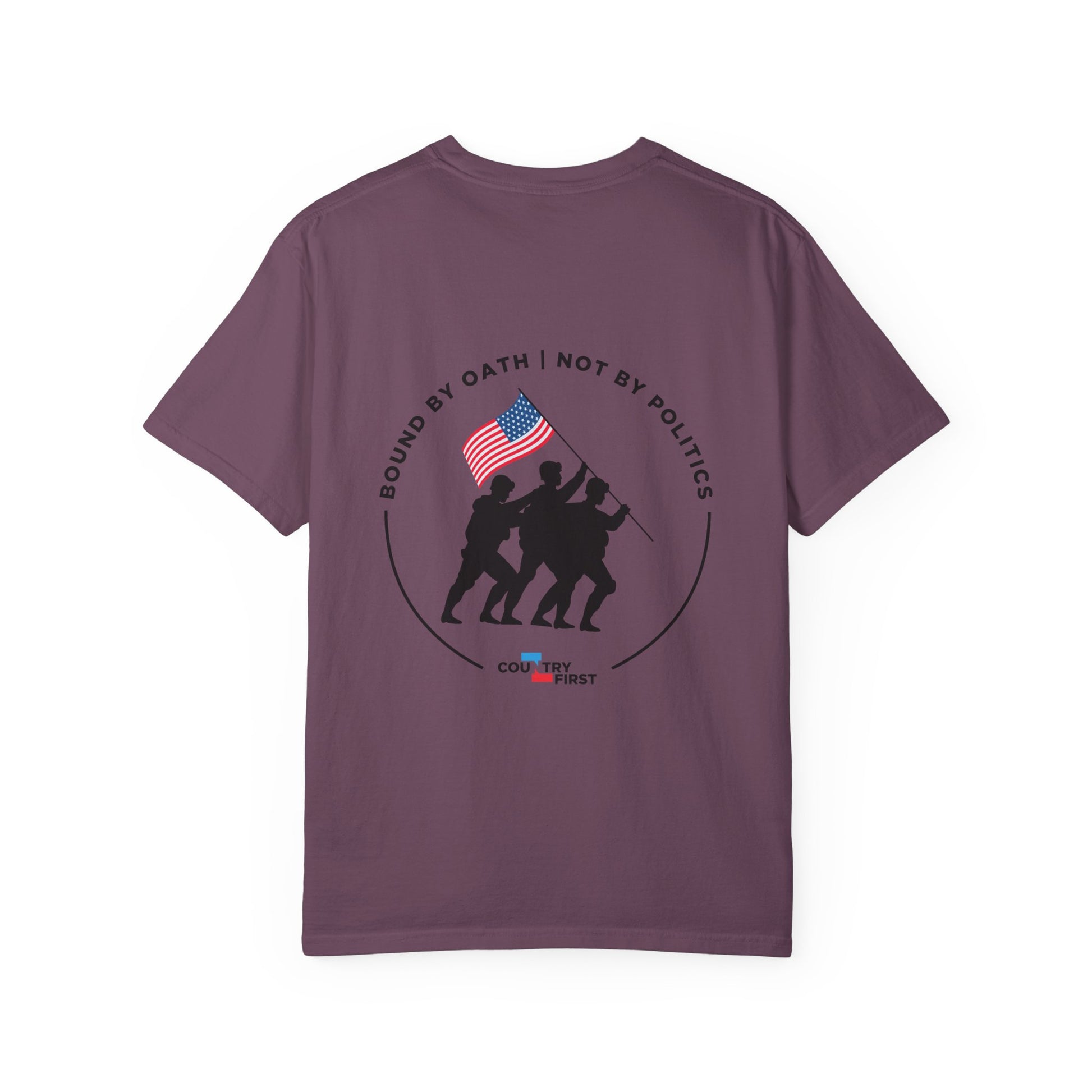 This heavyweight garment-dyed tee feels like a quiet pledge you can wear. The relaxed, slightly lived-in fabric settles in around your shoulders, softening with every wash. On the back, a bold silhouette of service members raising a flag sits inside a subtle circle, below the words “BOUND BY OATH | NOT BY POLITICS.” It reads like a personal statement—steadfast, uncomplicated, respectful. Small, minimal color blocks on the chest keep the front clean while nodding to the design on the back.